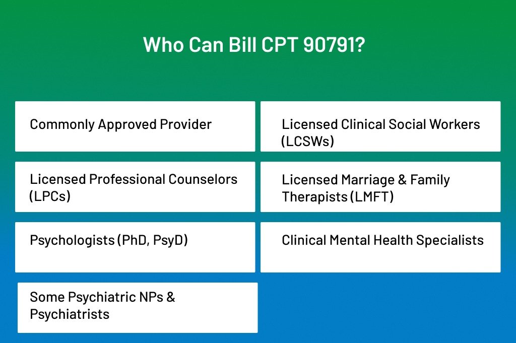 Psychologists (PhD, PsyD): These are the gold standard for diagnostic evaluations. Nearly every payer recognizes them for 90791 without hesitation.